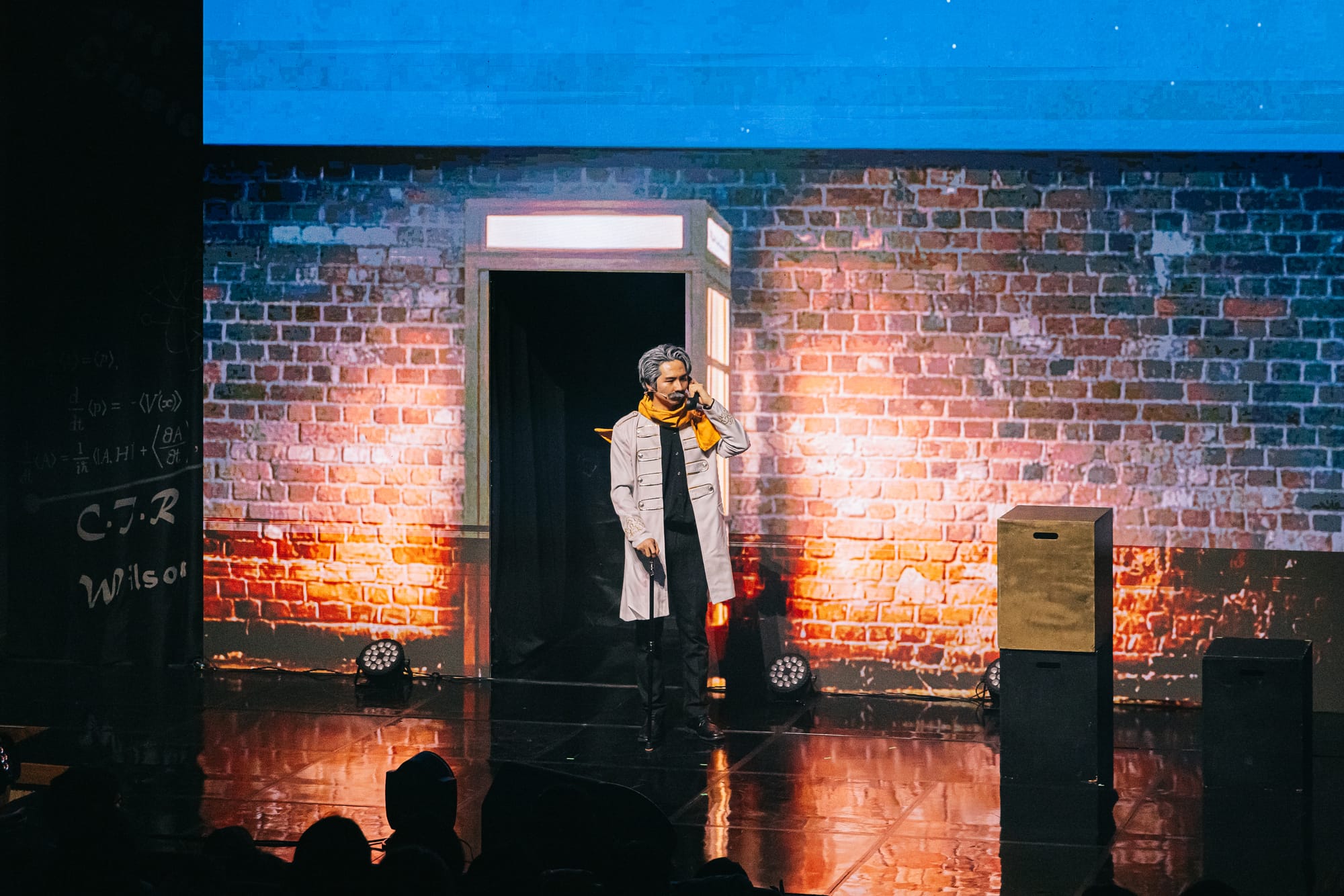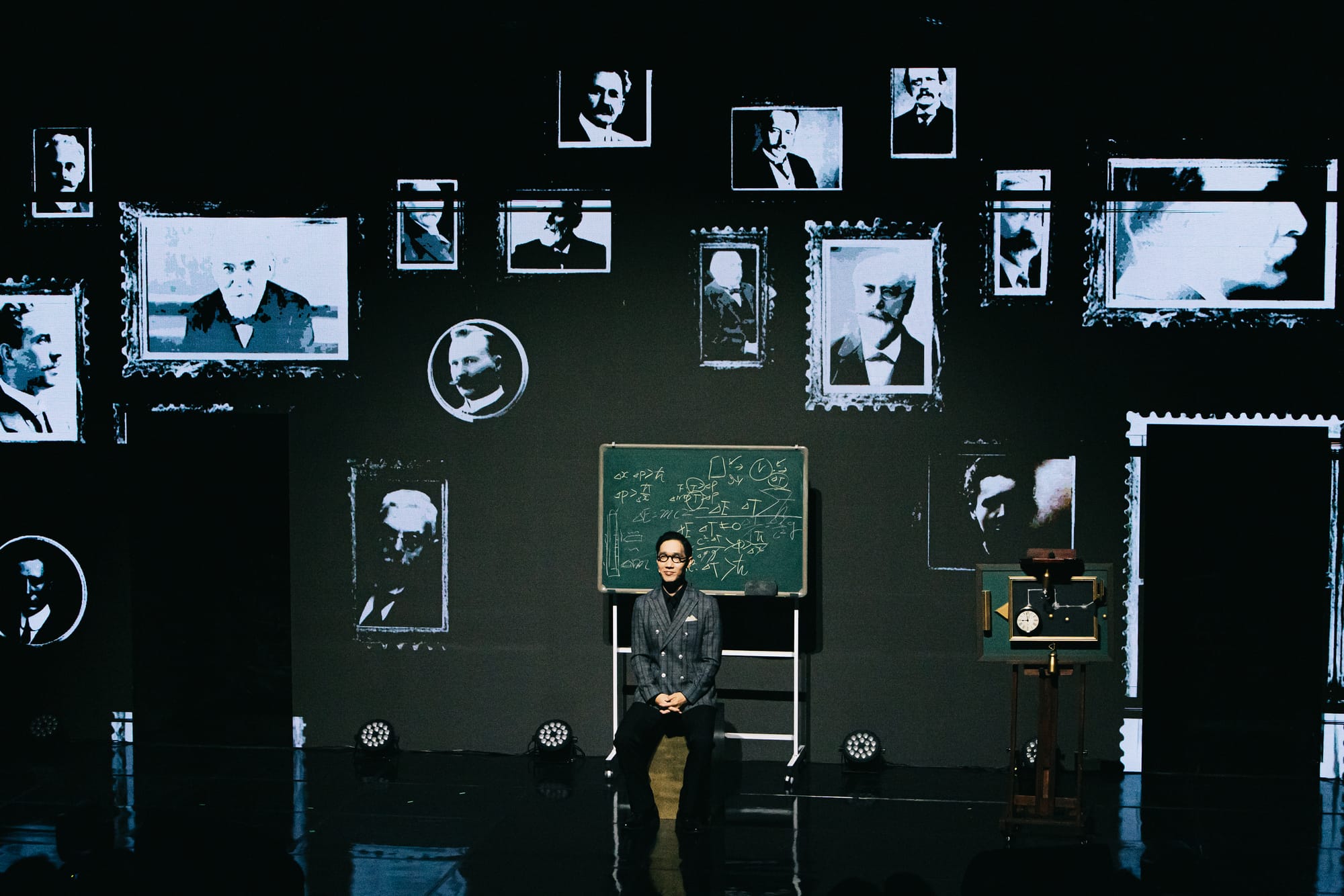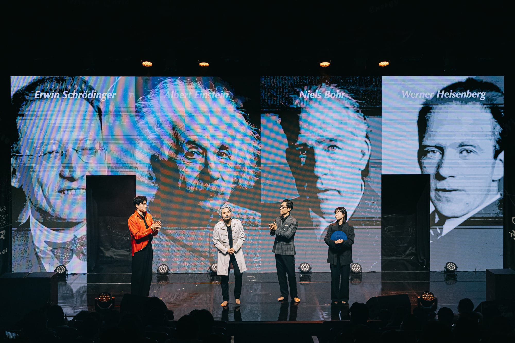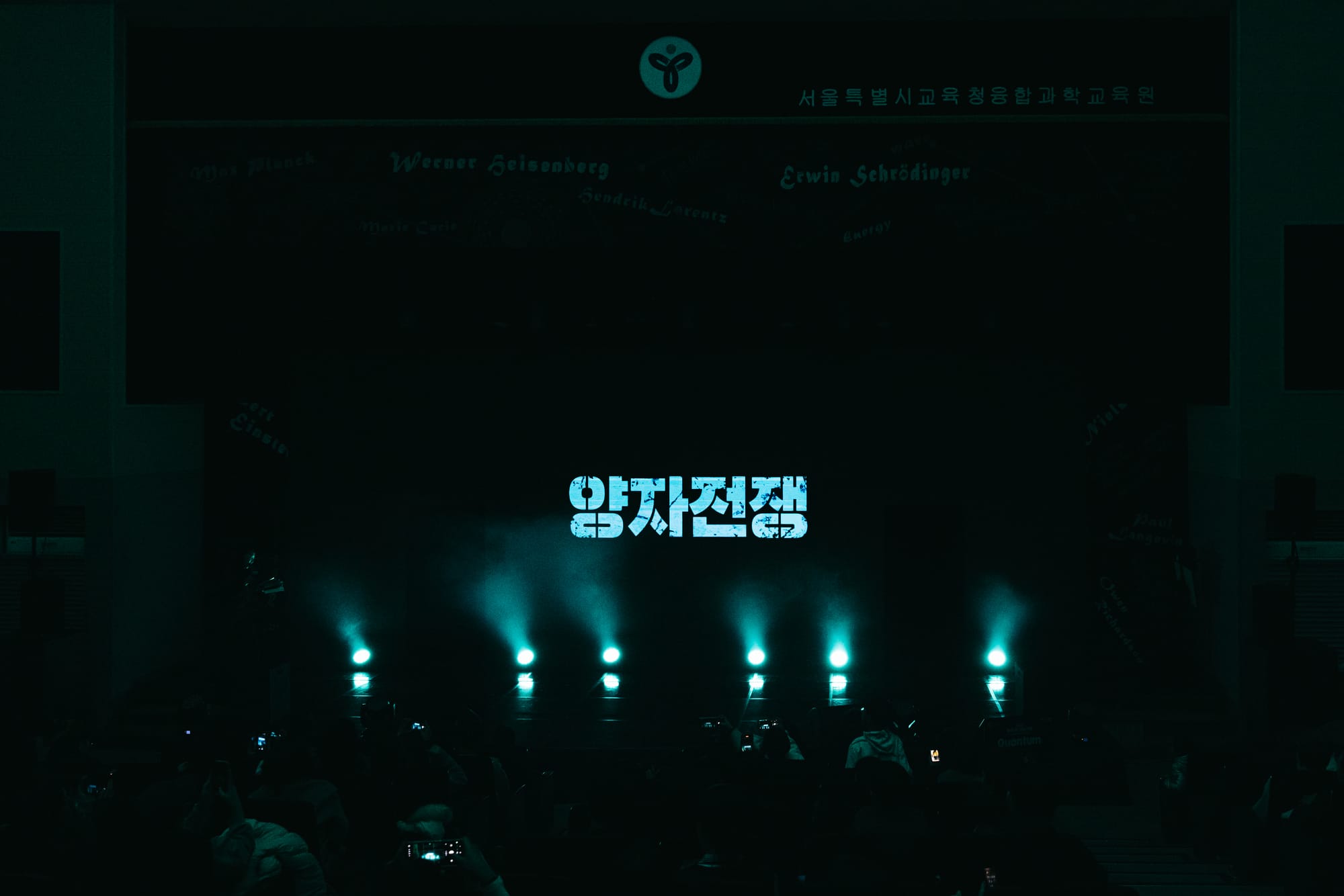 양자역학 확립 100주년을 맞이하여 진행된 융복합 과학문화 페스티벌 '무대 위 과학자들'에서 선보인 새로운 LED 버전의 <양자전쟁>! 기존에 손으로 직접 쓴 물리 수식공식으로 채웠던 아날로그 무대와는 또 다른 느낌으로 진행되었습니다. 양자역학 이론을 논할 때 빼놓을 수 없는 '이중슬릿'의 구조로 2개의 구멍이 뚤려 있는 LED 무대와 연극에서의 공간 문을 연결한 무대 영상 연출입니다.