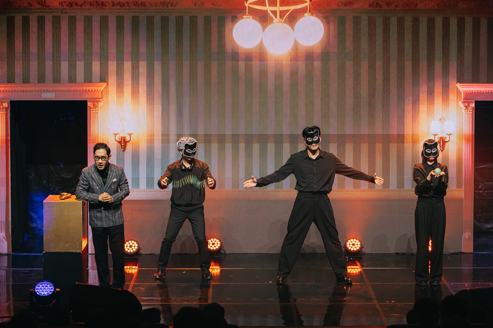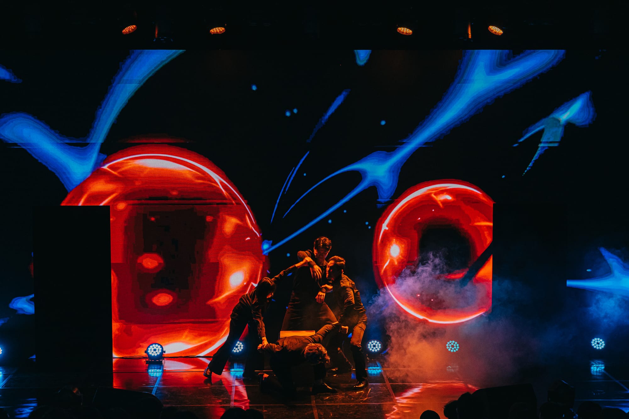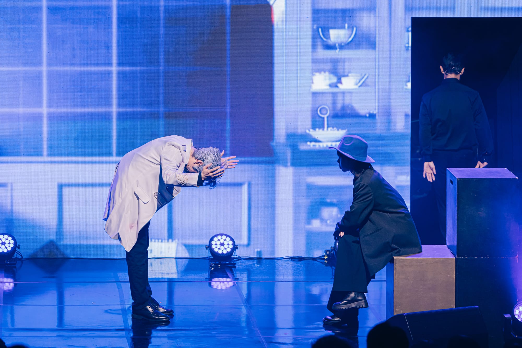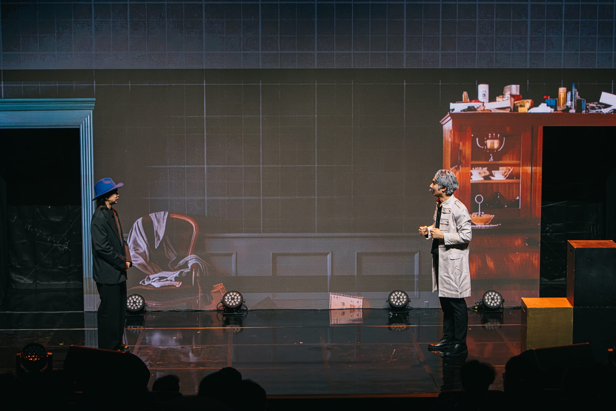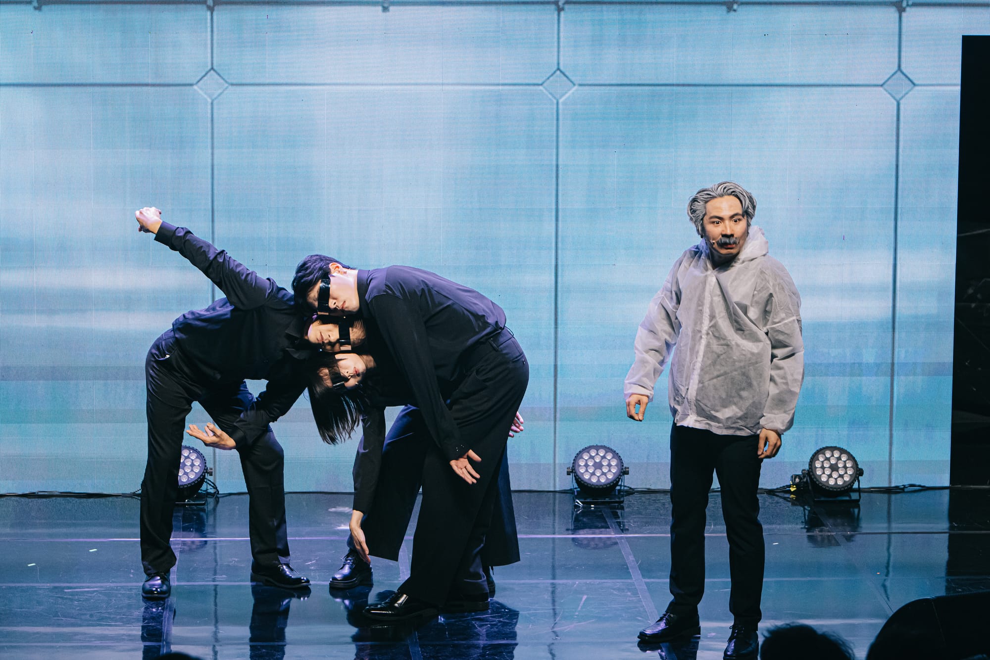 양자역학 확립 100주년을 맞이하여 진행된 융복합 과학문화 페스티벌 '무대 위 과학자들'에서 선보인 새로운 LED 버전의 <양자전쟁>! 기존에 손으로 직접 쓴 물리 수식공식으로 채웠던 아날로그 무대와는 또 다른 느낌으로 진행되었습니다. 양자역학 이론을 논할 때 빼놓을 수 없는 '이중슬릿'의 구조로 2개의 구멍이 뚤려 있는 LED 무대와 연극에서의 공간 문을 연결한 무대 영상 연출입니다.
